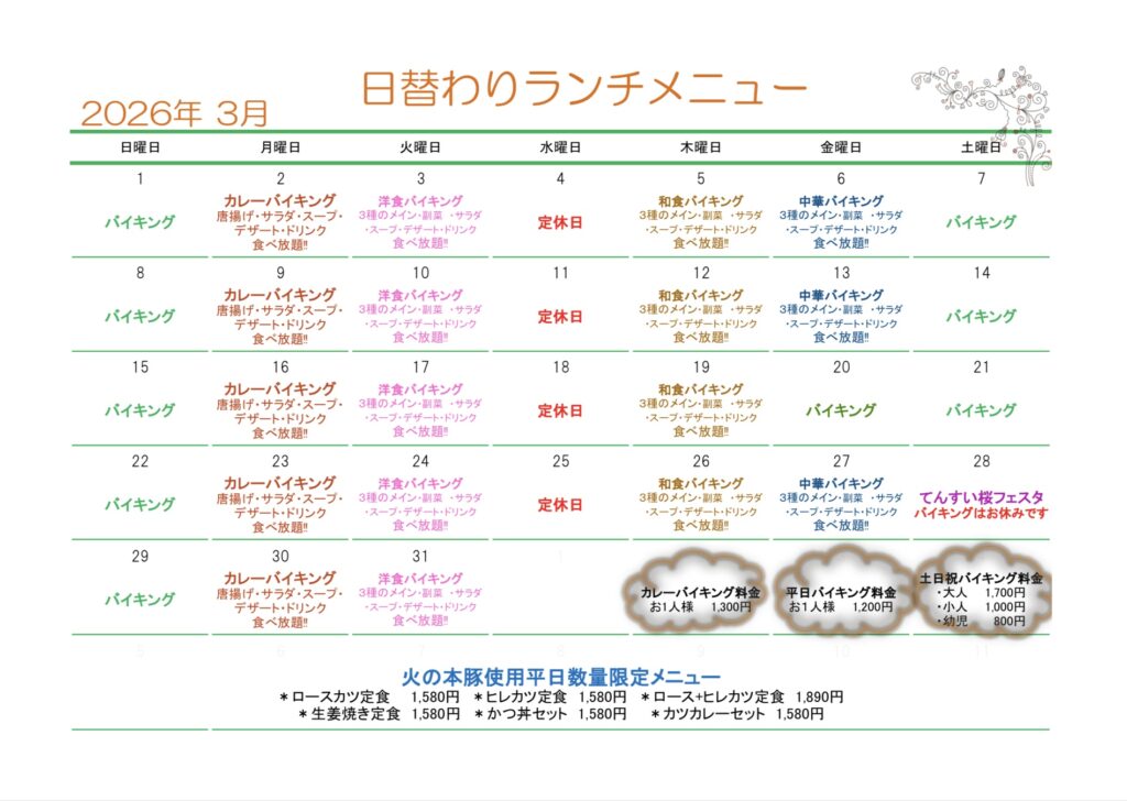 土日祝日だけでなく、平日も曜日替わりのバイキングをお楽しみください!